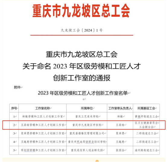 近日,九龙坡区总工会印发通知公布了2023 年度九龙坡区区级劳模和工匠人才创新工作室的通报,经基层推荐、初选、复审、专家综合评定等程序,九龙坡区中医院王鼎皓工匠人才创新工作室成功创建为区级劳模和工匠人才创新工作室。