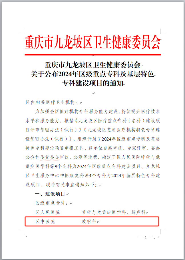 近日,重庆市九龙坡区卫生健康委员会印发的《关于公布2024年区级重点专科及基层特色专科建设项目的通知》,我院放射科成功获批区级重点专科建设项目,学科建设取得重大突破!