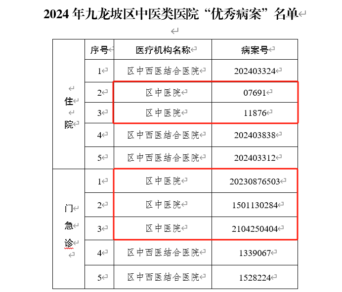 近期,区卫生健康委组织开展了“优秀病案”评选活动,经过采取院级自评、区级终审的二级评审,全区共评选出30份优秀病案。我院高度重视,认真组织评选,最终眼科、耳鼻咽喉科杨杰、脾胃病科张雪锋的3份门(急)诊病历,老年病科吴珍元、皮肤肛肠科蒋永威的2份住院病案脱颖而出,获得2024年九龙坡区“优秀病案”。