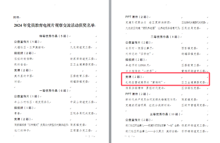 为深入学习贯彻习近平新时代中国特色社会主义思想和党的二十大及二十届二中、三中全会精神,九龙坡区中医院积极参加区委组织部2024年党员教育电视片观摩交流活动,在上级部门严格把关、逐级推荐、层层审核的基础上,经业务骨干互评、专家评审,区中医院党课《扎根在雪域高原的“黄桷树”》被区卫生健康委推选参评,并荣获区二等奖。