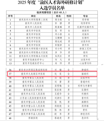 根据《重庆市卫生健康委员会办公室关于实施“2025渝医人才海外研修计划”的通知》要求,伉奕主任顺利通过英语六级水平测试及政治审查,经医院推荐,最终从全市二级以上医疗机构申报者中脱颖而出,其入选充分彰显了我院在专科诊治领域的学科建设成效。