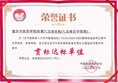近日,重庆市九龙坡区中医院佳讯频传,在学科建设与患者安全等多个维度荣获认可,彰显了医院卓越的综合实力与人文关怀精神。2025年10月27日,医院通过中国生命关怀协会的严格评审,被正式授予“《手术室患者人文关怀管理》团体标准贯标达标单位”。